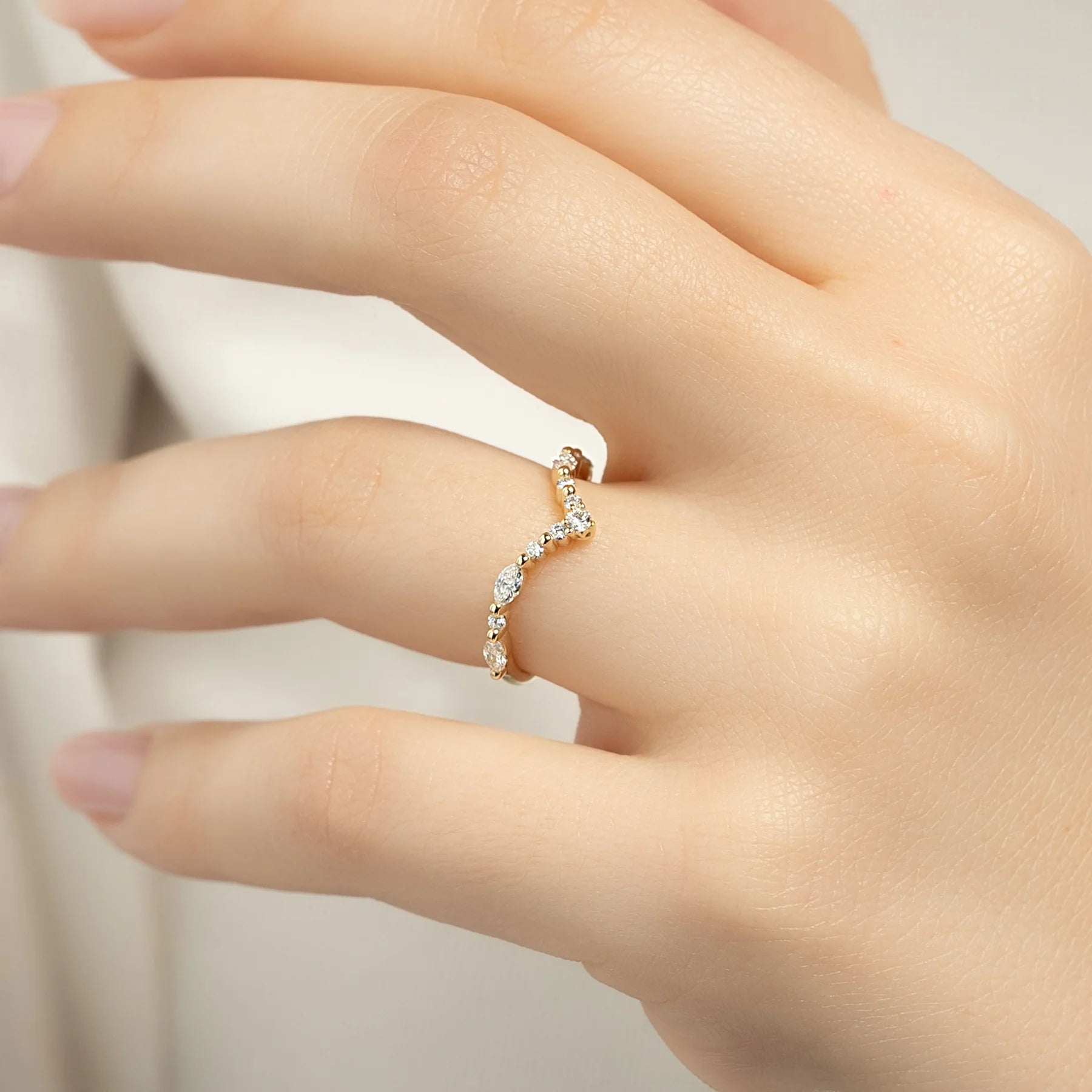 The Amalia is a fabulous ring that combines geometry, aesthetics, and immense sparkle. Round and marquise cut diamond accents are set along with the band in a shared prong setting. This piece design makes it easy to match perfectly with various engagement rings