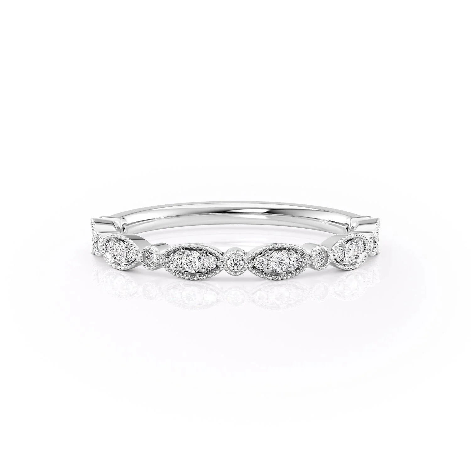 A vintage-inspired Jane wedding band. Its exquisite design combines small, round VVS diamonds and larger pear-shaped stones to create a unique visual pattern and immense sparkle. The back of the ring is comfort-fitted to give the wearer a pleasant all-day experience.