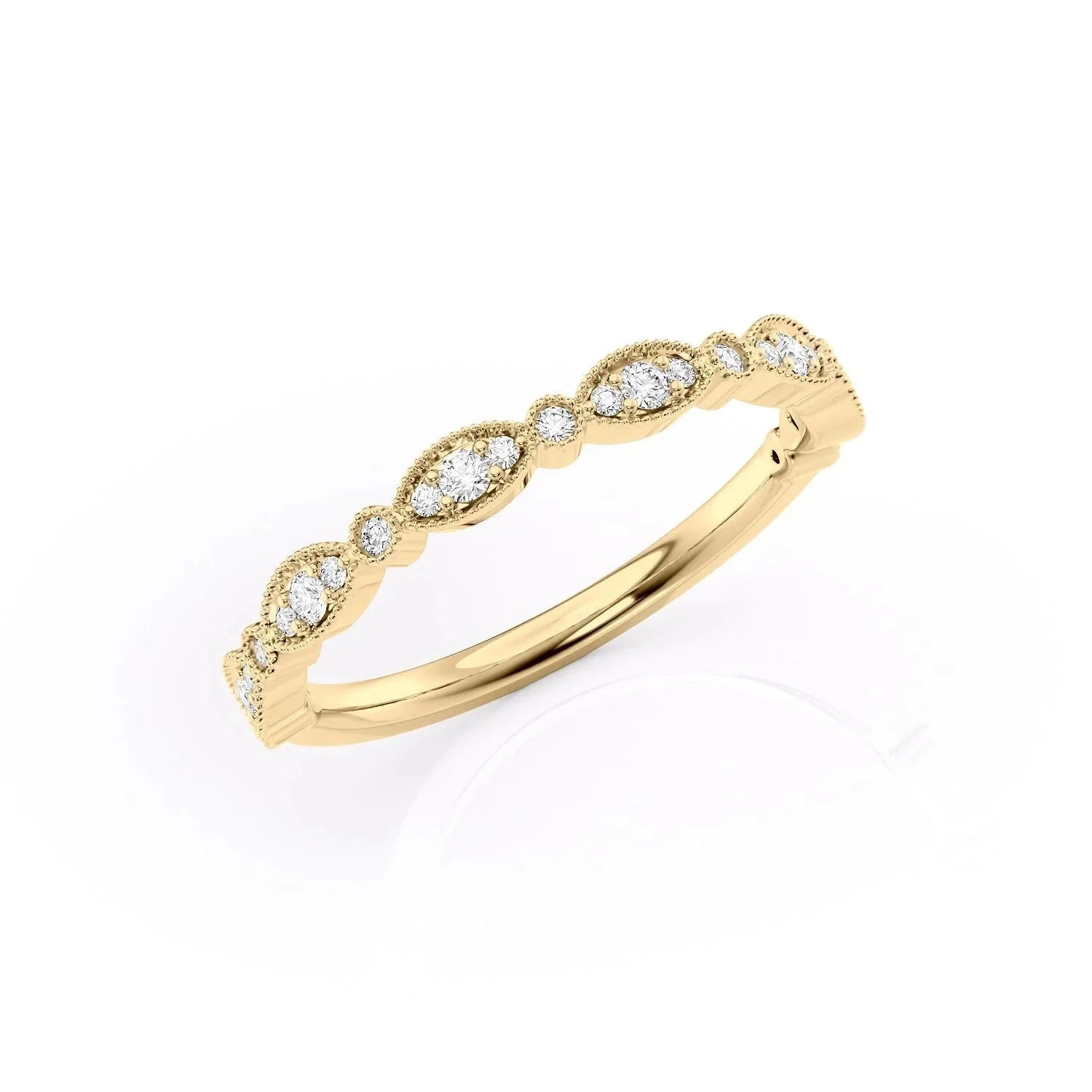 A vintage-inspired Jane wedding band. Its exquisite design combines small, round VVS diamonds and larger pear-shaped stones to create a unique visual pattern and immense sparkle. The back of the ring is comfort-fitted to give the wearer a pleasant all-day experience.